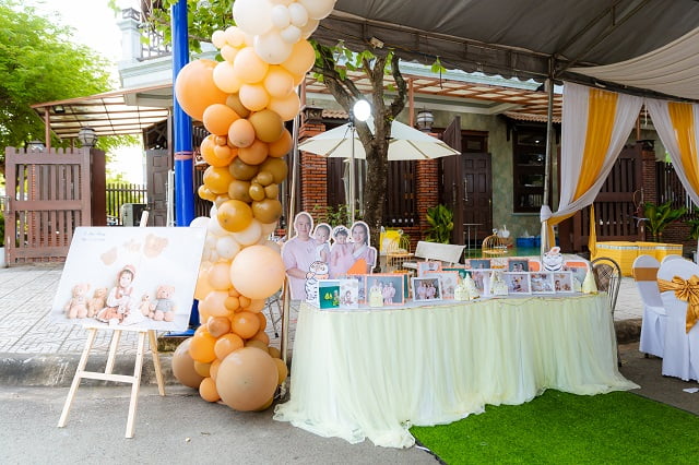 Bố mẹ của bé Phương Anh đã chọn gói trang trí tại Nhà Bong Bóng Việt, gồm 2 backdrop, 1 cổng bong bóng và bàn gallery. Mẫu backdrop trên sân khấu bao gồm 2 khung chữ U kết hợp lại, trang trí với line bóng màu sắc của một chú hổ, đồng thời có các chi tiết nhỏ xinh treo lên nền backdrop, tạo nét dễ thương và đáng yêu.